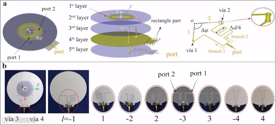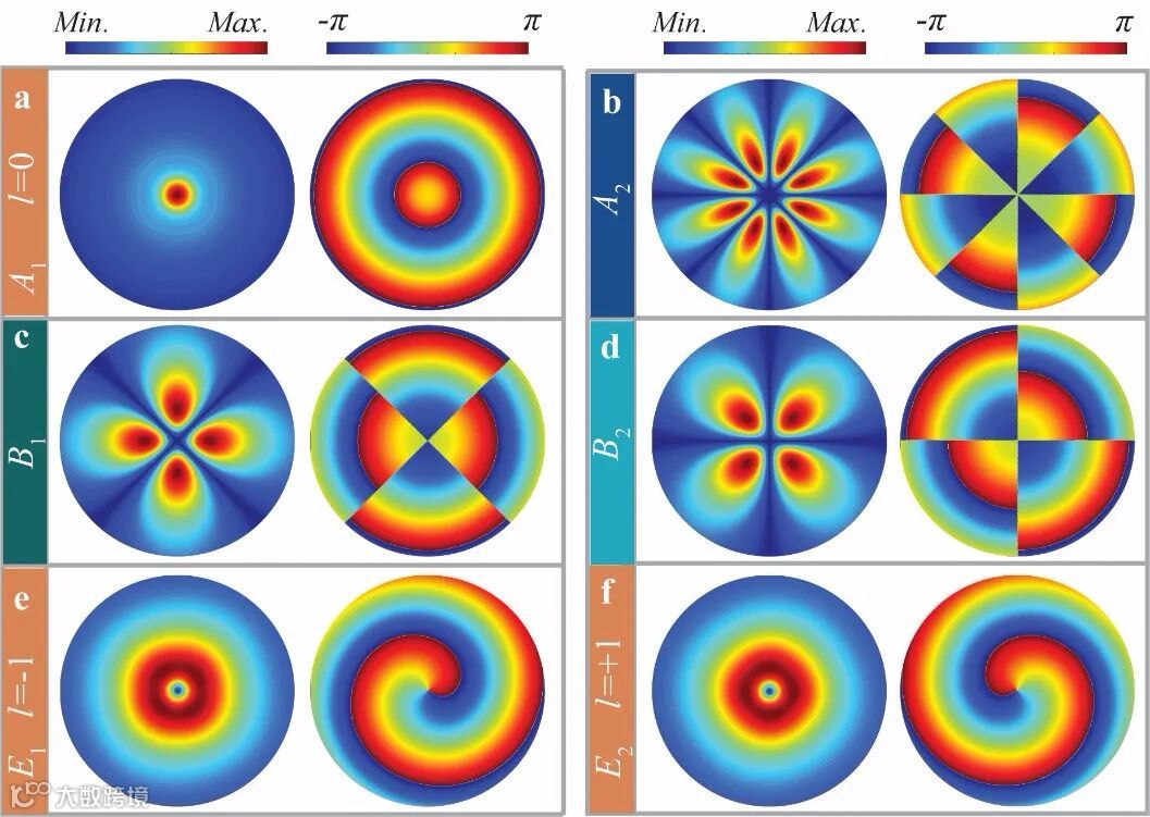 总结一下,我们的工作回答了在用电磁散射体产生涡旋波时,散射的对称性究竟起何作用的问题。群表示理论和电场积分方法的使用为两个非常基础的物理概念--对称性和涡旋波的电磁散--建立了连接。我们进一步为如何激发涡旋波提出了一个广泛适用的对称匹配条件。基于此条件,我们着重发展了二端口馈电方法用以选择性激发特定阶数的涡旋波。基于此方法,我们仿真实现并实验验证课径向阶数为1、拓扑荷从±1到±4的涡旋波的产生,也拓展研究了径向阶数为2、拓扑荷从±3到±4的涡旋波的产生。