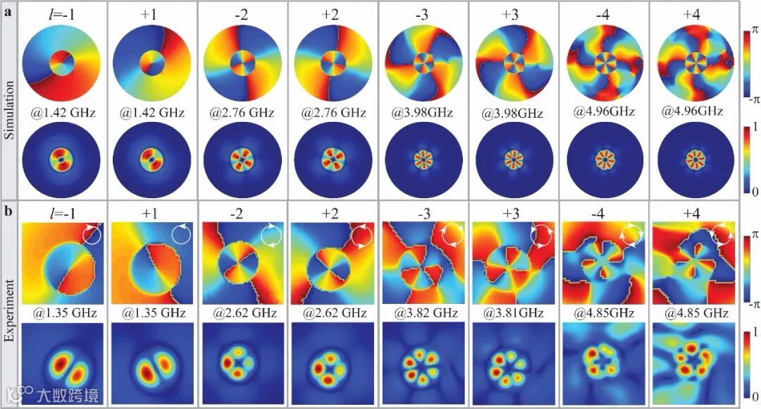 最后,为了验证我们的理论,我们设计了一个具有D48群对称性的微波等离激元谐振器。该谐振器可以实现多阶的局域人工表面等离激元对称和反对称模式。我们设计了八组具有不同几何夹角和相对相位延迟的二端口馈电网络用以激发阶数为±1到±4的涡旋波,设计和加工样品如图4所示。仿真和实验结果如图5所示,二者展现出很好的一致性,也很好地证明了我们的理论。前面实现的涡旋波径像分布参数均为p=1。作为拓展性研究,我们也仿真观测了具有高阶径向分布(p=2)的涡旋波,如图6所示。