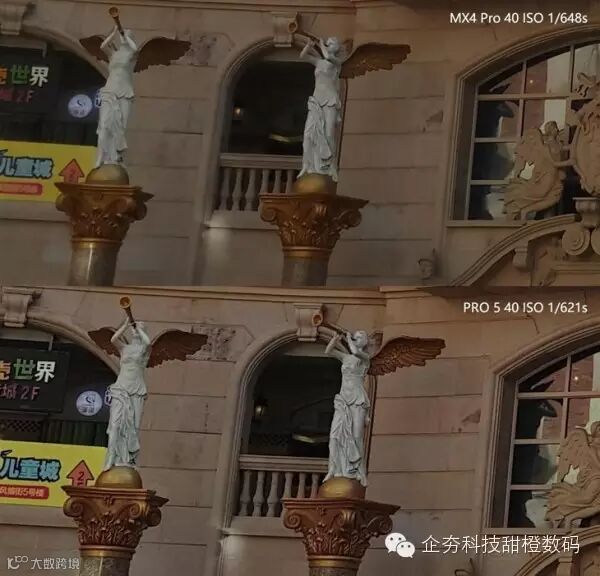 选择样张中心区域的100%进行对比,PRO 5的细节明显比MX4 Pro丰富,也更为有层次感,无论是左边标牌文字,还是中间雕像和座台细节,或者是墙面石砖的结合处都是如此,MX4 Pro大理石纹理已经一团糊,PRO 5的纹理虽然不能说清晰可见,但至少可以区别。