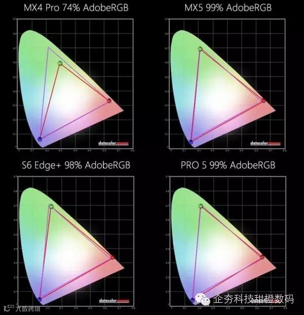 此外,我们还使用Spyder 5 Elite校色器对各个屏幕Adobe RGB色域进行了测量,其测试结果MX5和PRO 5为99% Adobe RGB色域,Edge+为98%,而MX4 Pro为74%。但实际上Sypder 5 Elite产品本身从原理上并不支持AMOLED,无法覆盖完全色域,这个测试结果并不能完全采信,部分媒体使用Spyder 5 Elite进行色域测量是不严谨。不过其还是可以在一定程度说明MX5和PRO 5的AMOLED相比传统的LED背光的LCD在色域上有明显优势。