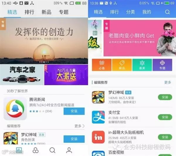 这样的情况不仅仅是限于音应用乐,资讯、主题美化,应用商店等App的设计都有所退化,偏向主流的风格设计,这样的退化有UI设计布局方面的,也有细节处理上的,相当多的地方甚至可以看见土鳖的过渡色设计,这是与现在偏平化设计的大方向背道而驰。
