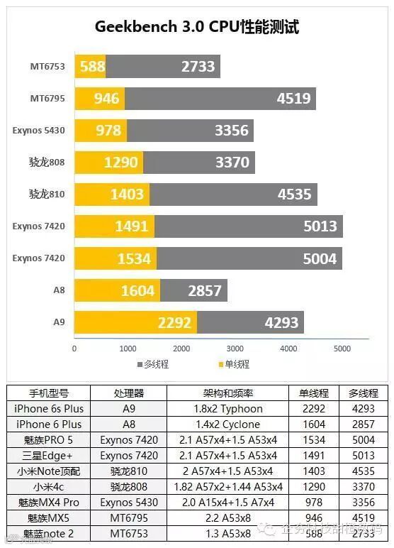 相对采用小核心A53x8的MX5,其单线程性能也高上87%,虽然同为A50 64位核心,但我们还是可以发现大核心和小核心性能差距还是巨大的。而多线程测试PRO 5和MX5的差距大幅缩小,这是因为MT6795的四个A53 2.2频率远远高于7420 1.5的频率,这样使得MX5在小核心性能上扳回不少,不过小核心的本意是跑低负载降低功耗,这样的高频A53并非ARM的本意,也没太大意义,单线程性能还是和用户体验有更为密切的关系。