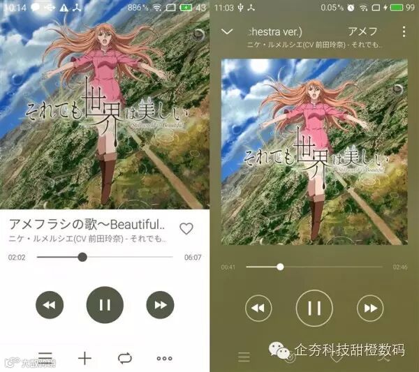 Flyme OS 5的退步不仅仅是操作逻辑上,还有审美品位上的。这里以系统内置的音乐App来对比分析。音乐的播放界面,Cover不再是全屏宽度,而增加了一个Cover重度模糊处理的主色调的背景,歌曲名在顶部显示,歌曲名两边还有后退按钮和功能菜单,使得歌曲名的显示位置很局促,显示不全稍长的歌名。这样的界面设计空间利用率下降,也不如之前的设计简明优雅。