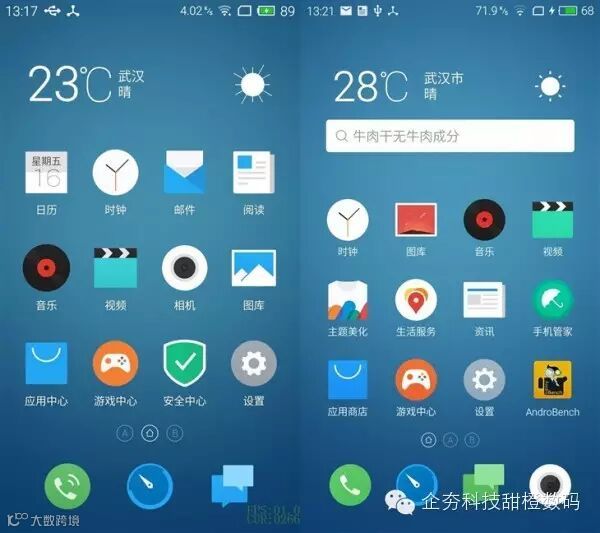 从传播正能量的角度看我们先来说好的地方。在MX3时代,Flyme OS 3的主屏的图标为4x5,而在Flyme OS4改成了4x4,这样同屏的信息容量下降了1/5,而Flyme OS 5又回归到了4x5。只所以这样变化,是因为自魅蓝note以后的机型都为屏幕更长的16:9分辨率,有足够充裕的纵向空间多布置一排图标。