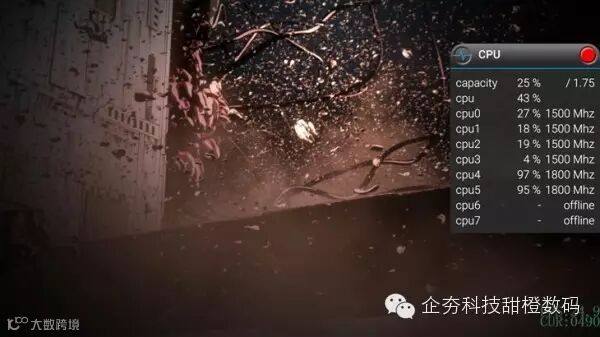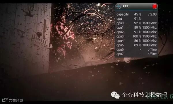 使用MX4 Pro播放1080p H264 10bit的高动态画面的希德尼娅骑士在线核心占用率几乎全部100%,右下的FPS也惨不忍睹。