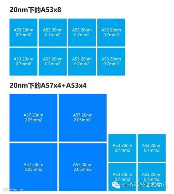 而PRO 5这次采用的三星旗舰级别的Exynos 7420处理器,其为Cortex-A57x4 大核心+Cortex-A53x4小核心的Big.Little架构。在假设的相同工艺条件(20nm)下,A57的规模接近A53的三倍,而性能也接近A53的两倍。虽然A57的绝对性能/面积比并不如A53,但其还是可以达成更高的绝对性能。