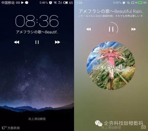 在M9时代,我的评测就提出希望可以在锁屏界面显示播放专辑封面,这个功能终于在Flyme OS 5上实现,但这样实现的效果并不如预期,周围大面积的空间用封面主色调的模糊处理作为背景,中间的圆形面积显示封面,这样的设计给人感觉细节不足,不够精细。这些的设计初衷是为了避免Cover分辨率不高