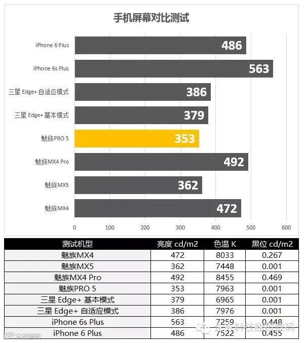 由于MX5/PRO 5/EDGE+采用AMOLED,全黑可以做到完全不发光,其黑位和动态对比度表现都要更好,而iPhone 6 Plus漏光比较明显。
