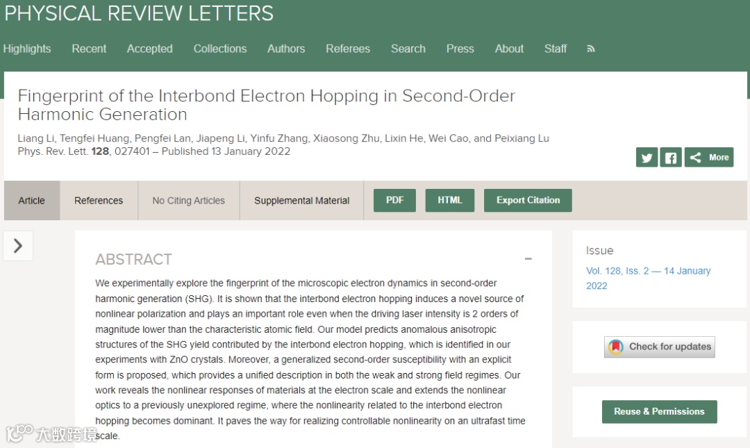 2022年伊始,物理学顶级期刊《物理评论快报》(Physical Review Letters)接连发表了陆培祥教授领导的超快光学实验室、国家自然科学基金委「强场超快光学」创新研究群体两篇论文。
