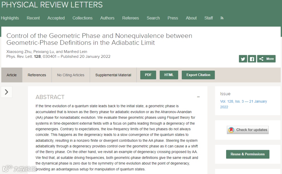 该工作以《几何相位的控制和绝热极限下几何相位定义的不等价性》(Control of the Geometric Phase and Nonequivalence Between Geometric-Phase Definitions in the Adiabatic Limit)为题于2022年1月20日在线发表在Physical Review Letters上。祝晓松副教授为论文第一作者,陆培祥与汉诺威大学的Manfred Lein教授为共同通讯作者。