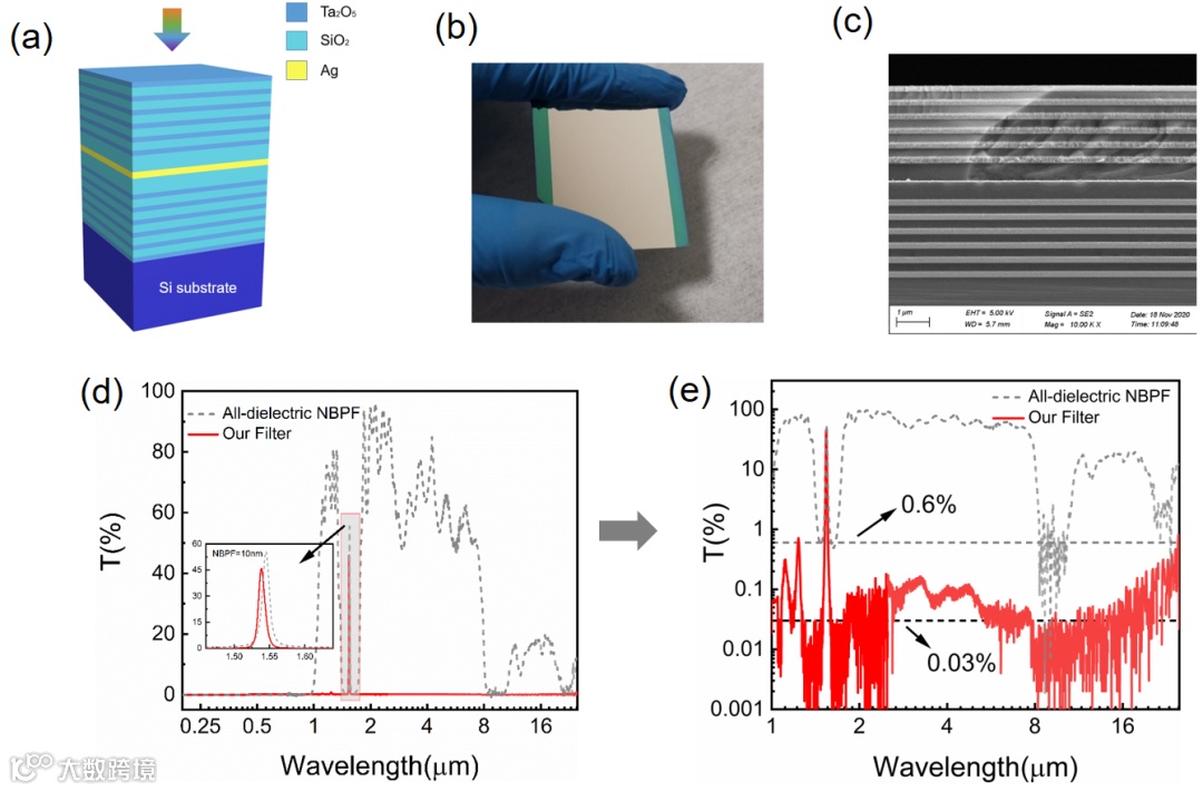 图2 双TPPs的实验结果。(a)双TPPs模型;(b)双TPPs的样品照片;(c)SEM照片;(d-e)透过率测试结果,其中红线为双TPPs样品的透过率,灰色虚线为全介质窄带滤波器的透过率。