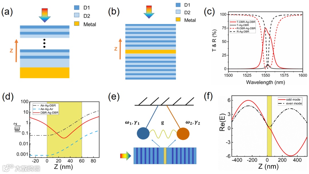 的频率相等时,通过求解方程(1),我们可以发现两个特性:第一,其本征频率将劈裂成两个,低频的被称为偶模,高频的被称作奇模,而劈裂的程度和耦合系数成负相关;第二,在本征频率处,左边谐振子的能量能有效传递给右边谐振子。从图1(c)的反射谱中就可以看出,对于红色虚线而言,其有两个反射谷,波长较低的地方为奇模,波长较高的地方为偶模。这两个点处的电场分布分别绘制如图1(f)所示,由于奇模的电场成奇对称分布,因此其在金属层处的电场强度低,从而相比于偶模还会有更低的吸收。