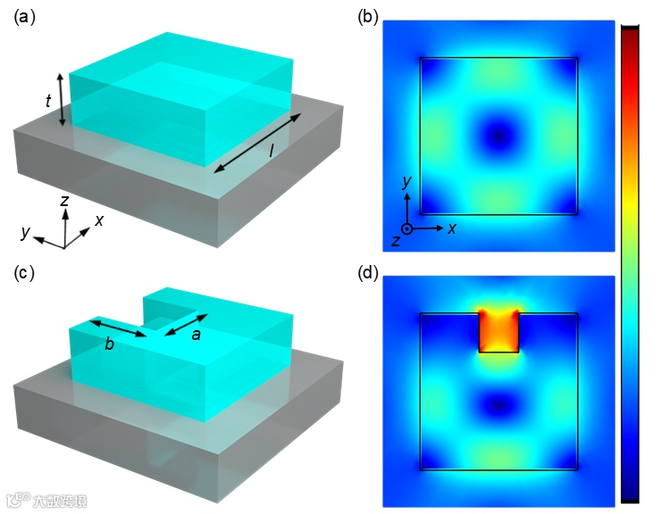 图1.单个硅纳米立方体的结构示意图(a)及其模式分布(b);引入空气凹槽的硅纳米立方体结构示意图(c)及其模式分布(d)。