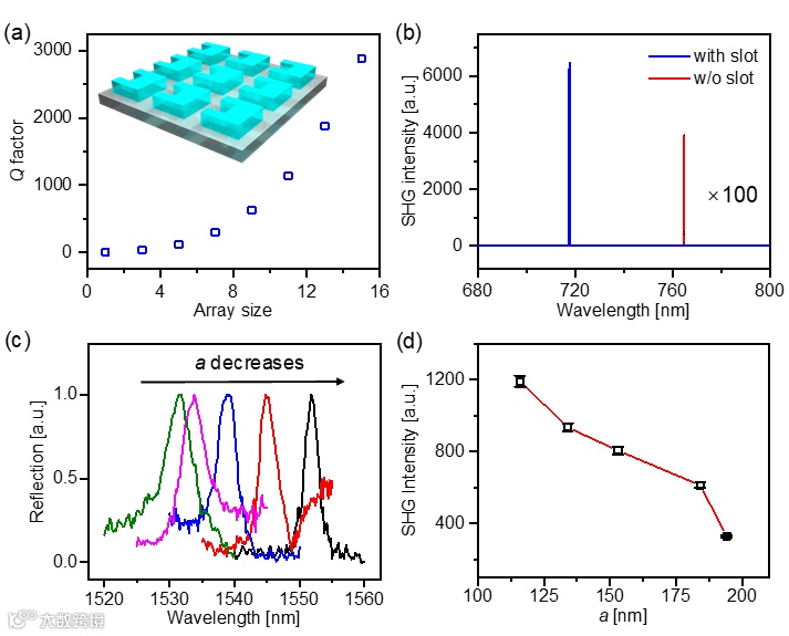 图2.(a)结构仿真Q值与其阵列数的关系,插图为阵列数3 x 3的阵列结构示意图;(b)有/无空气凹槽阵列结构的SHG计算值对比;不同尺寸空气凹槽阵列结构的实验反射谱(c)与SHG(d)对比。