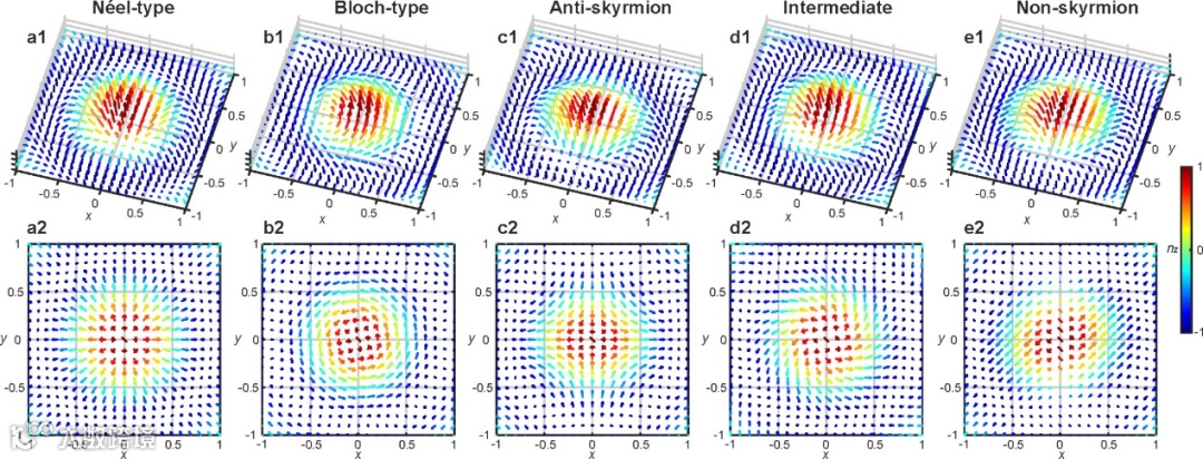 图1 左:斯格明子矢量场与参数空间矢量球的映射;右:斯格明子可以具有不同拓扑形态(Neel型展现刺猬形态,Bloch型展现涡旋形态,Anti型展现马鞍形态)