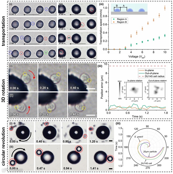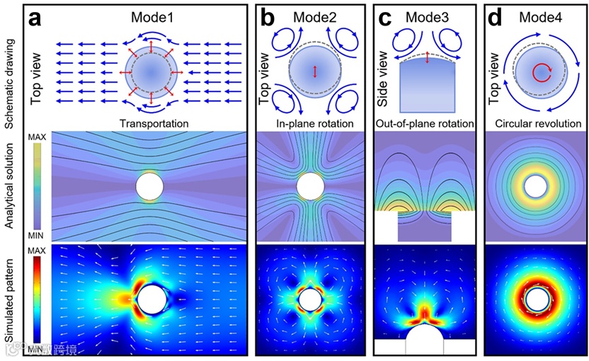 近日,北京航空航天大学机械工程学院仿生与微纳研究所冯林副教授等研发了一种基于声驱微气泡的模态可切换的多功能微操控系统,该系统能够在微流控芯片内实现可控且高效的微对象运输、三维旋转和公转等操控模式(图一)。