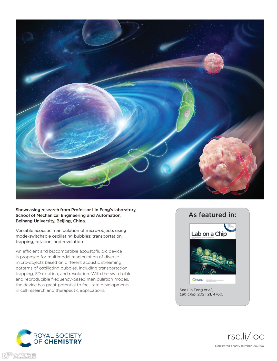 该项研究成果获得国家重点研发计划(No. 2019YFB1309700)及北京新星科技计划项目(No. Z191100001119003)支持,以“Versatile acoustic manipulation of micro-objects using mode-switchable oscillating bubbles: transportation, trapping, rotation, and revolution”为题发表于国际期刊《Lab on a chip》。