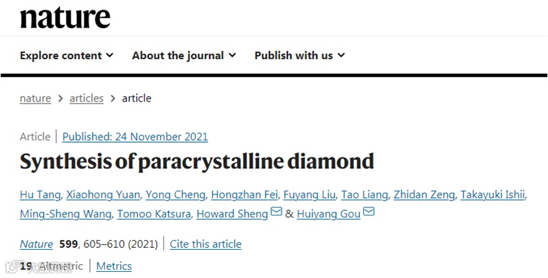由北京高压科学研究中心的缑慧阳研究员带领的国际研究小组在高温高压条件下,合成了一种新形态的金刚石——次晶金刚石 (Paracrystalline diamond),这种新形态的结构填补了非晶结构和晶体结构之间原子排列尺度上的缺失环节。此成果犹如科学的罗赛塔石,对深层次理解非晶材料的复杂结构提供了解密的钥匙。该项工作以“Synthesis of paracrystalline diamond”为题于11月25日发表在顶尖科学杂志Nature上。(DOI:10.1038/s41586-021-04122-w)。