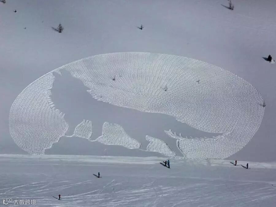 10. 艺术家西门•贝克利用雪地鞋和指南针在加拿大一滑雪场制作了一个大型的动物图形作品。