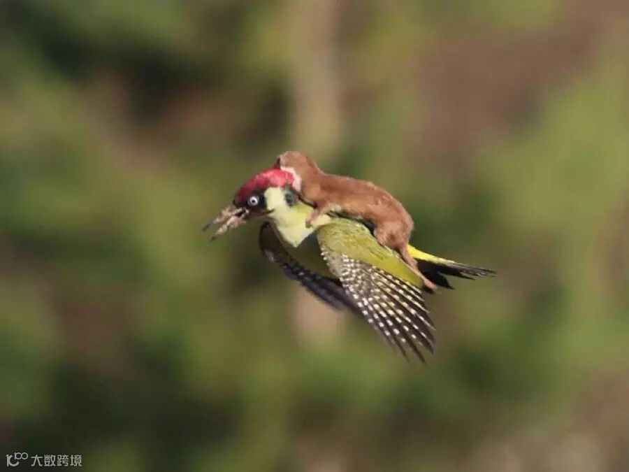 12. 这张鼬鼠乘坐啄木鸟飞行的照片在网上火了一把。这只鼬鼠估计当时朝啄木鸟发动攻击,不想被带着飞走了。