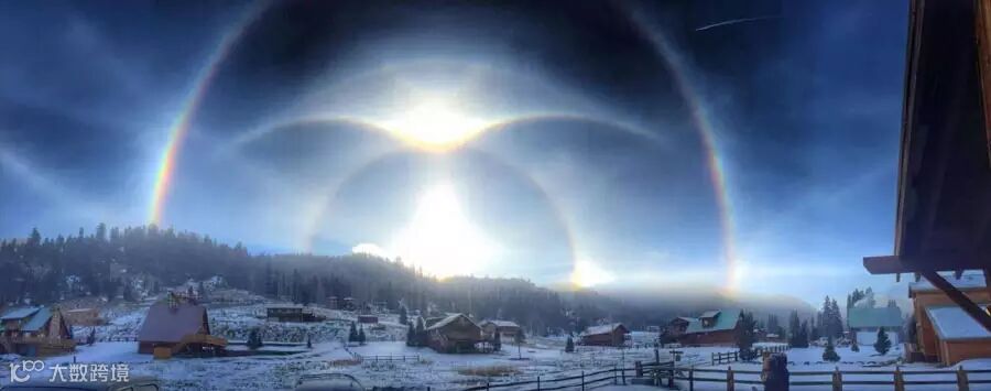 21. 摄影师在新墨西哥州红河镇上空拍到美丽的“冰光环”。“冰光环”是一种光学现象,当气温下降时,悬浮在大气中的冰晶与光互相作用,在天空中形成各种各样的环弧。