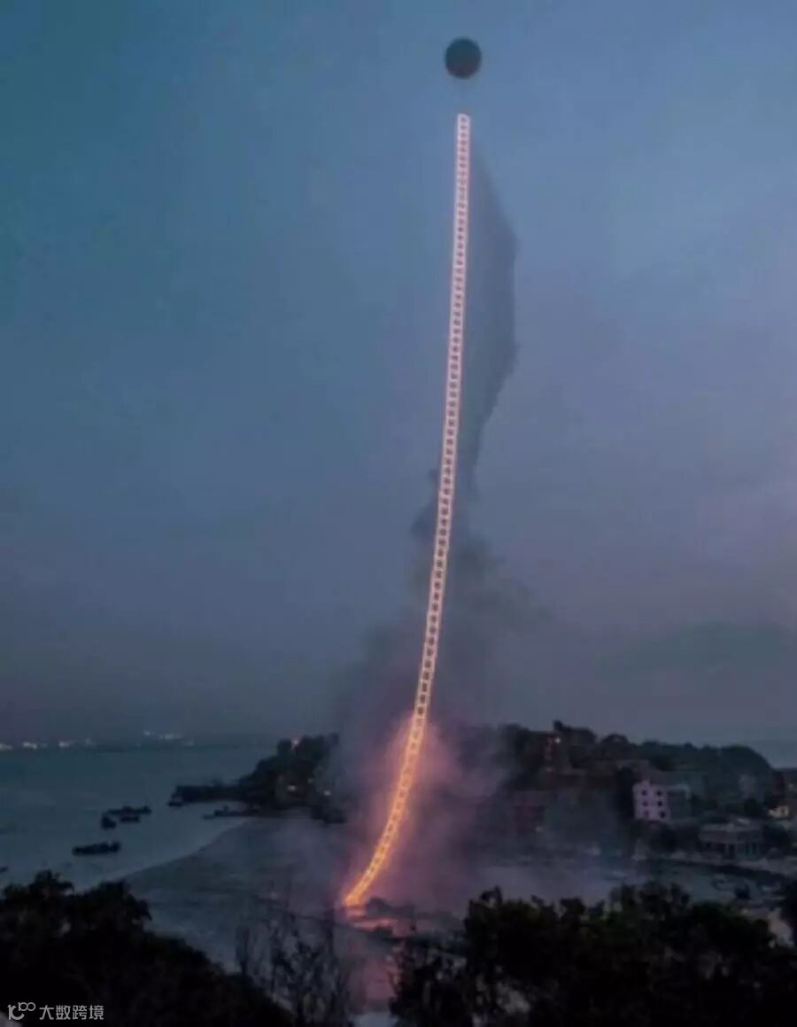 8. 著名艺术家蔡国强在家乡泉州惠玙岛点燃500米《天梯》。这个500米高、5.5米宽的绳梯,借助氦气球拉起升空。点火后,它好像一座金色焰火梯子刹那间拔地而起,带着人们仰望天空,与无限对话。