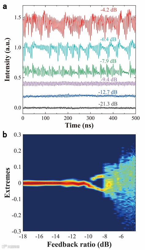图1:(a)带间级联激光器在不同反馈强度条件下的时序波形;(b)激光器动力学演化过程的分叉图。