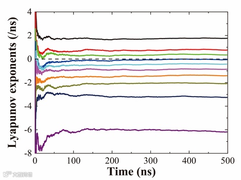 图2:带间级联激光器超混沌的Lyapunov谱线图。