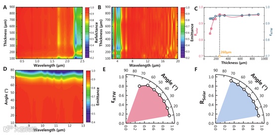为了确定RCC的最小厚度要求,研究了光学性能对涂层厚度的依赖关系。如图3A到C所示,随着厚度的增加,太阳能反射率表现出比近红外发射率更明显的上升。显然,在厚度低至150μm的情况下,RCC仍然可以实现0.93的高太阳反射率,并且RCC的热红外发射率始终超过 0.93,即使涂层厚度仅为100μm(图3C)。根据图3C上的黄点,当涂层厚度超过260 μm 时,光学性能趋于稳定。此外,还表征了不同偏振角下RCC的热红外发射和太阳能反射光谱(图3D到F)。