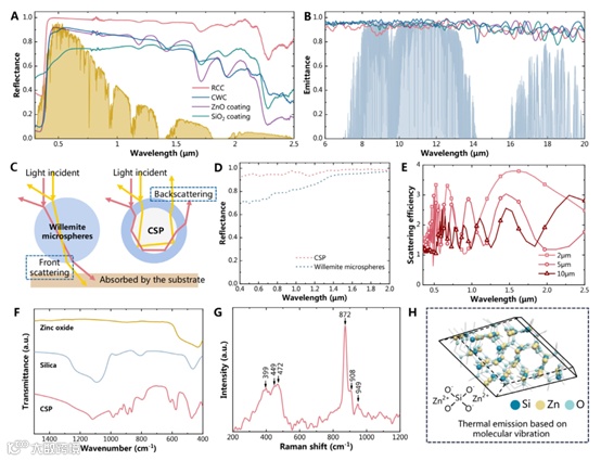 RCC、商用白色涂料(CWC)、ZnO涂层和SiO2涂层的光谱特性被定量表征,如图2A和B所示。所有这四个样品都表现出超过0.94的高热红外发射率,而RCC具有超过0.95的超高太阳能反射率,但CWC、ZnO涂层和SiO2涂层分别只有0.82、0.81和0.71。值得注意的是,RCC的太阳能反射率和热红外发射率与基板无关。为了深入了解提高太阳反射率的机制,探索了核壳粒子对光散射行为的改进。如图2C所示,核壳结构由于核壳的反射率不同,可以改变粒子内部的光路。对于均质颗粒,光主要是向前散射,这种前向散射方式导致散射光被基板吸收。而在核壳颗粒中,散射光在核壳界面处经历了经过修改的光路,其中大部分光以与入射光相反的方向从颗粒中逸出。因此,预期更强的背向散射可以促进涂层的反射特性。图2E显示了太阳光谱中特征直径为2.5和10 μm的CSP的散射效率,制造的粒子有助于在可见光区和近红外区超宽波范围内有效地散射入射太阳辐射。该RCC具有比ZnO涂层和SiO2涂层更好的对太阳短波辐射的抑制能力。此外还通过FTIR光谱和拉曼分析(图2F和G)探索了热辐射能力背后的物理特性。