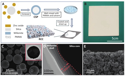 南京理工大学范德松教授课题组以简单、方便、经济的方法设计并制备了一种用于高性能辐射冷却涂层(RCC)的核壳粒子(CSP)如图1所示。低成本的原材料和易于制造的工艺使提出的RCC能够大规模生产。该RCC很容易刷或涂敷到不同的基质,如铝、木材、玻璃、水泥和不锈钢上,显示了在实际应用中与各种材料和几何形状建造的建筑或设备兼容的巨大潜力,这与市面上的产品相比是有利的。