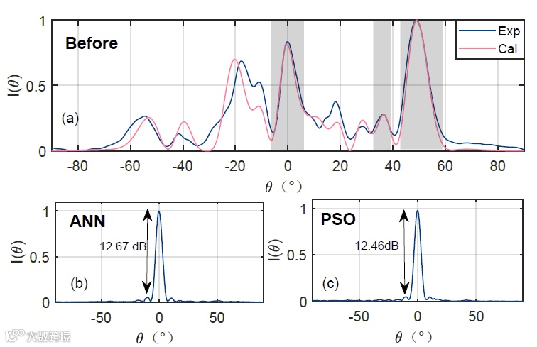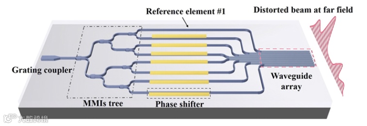 光学相控阵从一系列阵列单元中发出相干光,通过调控每个阵列单元的相位以使波阵面发生旋转,从而改变光束的指向。然而,基于波导的集成光学相控阵在微加工过程中由于制造工艺的偏差,会不可避免地引起每个阵列单元的相位偏差,从而使得光学相控阵这种相位敏感型器件产生严重问题,具体表现为相控阵出射光束弥散而不是呈现理想的汇聚形式。通常的解决方法是借助优化算法不断调整各阵元的移相器相位,直至出射光束达到理想状态。对于一个包含N个移相器的光学相控阵,这相当于在N维空间中搜索最优解。由于N个移相器的相位分布与出射光束角分布的对应关系是非线性的,这个搜索最优解的过程通常需要大量的迭代,而且经常不能搜索到真正的最优相位校准状态。