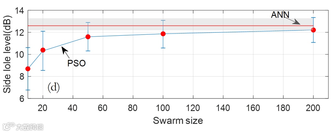 图4. 实验:(a) 校准前器件产生的光束;(b) 经过人工神经网络(ANN)校准后的相控阵的光束;(c) 经过传统迭代算法(PSO)校准后相控阵产生的光束。(d) 神经网络与传统迭代算法(PSO)收敛与偏差特性仿真