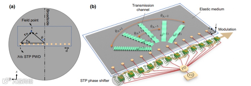 弹性波波导由于其对缺陷的敏感性和低阻尼特性,在结构健康监测、无损检测和生物医学成像中具有广泛的应用,可以实现无耗散下长距离传输,并通过衍射光栅和超表面操纵入射波的方向。相控阵是多个波发射和接收元件的组合,以一维(线性)、二维(平面)或三维(半球)排列。传统相控阵可以通过不同阵元发射的波场之间的建设性和破坏性干扰,在所需方向上传输弹性波,而相控阵提供了一个多功能的平台,可服务于复杂多样的声学工程应用。传统的超声波相控阵只能在单个通道中工作,根本无法实现内部闭合裂纹的高分辨率3D成像,这是由于互易对称性,现有相控阵仅对入射波敏感,入射波的准确方向只能与其传输方向相同。为此人们引入非互易性的概念,在相控阵平台表现为不相同的辐射和接收波束形成模式,可以独立调谐。