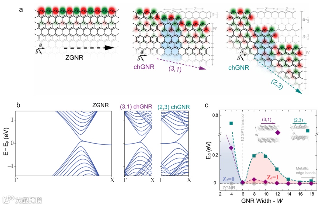 材料的能带拓扑分类已成功地应用于预测和解释物质奇异态的出现,如拓扑绝缘体中的量子自旋霍尔(QSH)边缘态或拓扑超导性。这种分类依赖于对称对拓扑序的保护,当对称发生改变时,它可以经历拓扑相变。对称保护拓扑(SPT)相变在人工半导体系统中被观察到,例如二维量子阱的HgTe和一维有机聚合物。关键因素是存在两个间隙的SPT相,传统的(平凡的)绝缘带和非平凡的拓扑绝缘态,被一个金属态隔开。尽管石墨烯是一种半金属,但它可以通过在费米能级附近打开一个能隙,并赋予晶格额外的手性对称相互作用来建立SPT相。例如通过建模一维Su-Schrieffer-Heeger (SSH)链,在扶手椅GNR的带隙内设计了一维 SPT 相,边缘部分包含局域带隙状态。然而,在锯齿型GNRs (ZGNRs)中,零能量边缘带的存在阻止了缺口拓扑相的出现。正如Kane和Mele所言,自旋-轨道相互作用的存在可以在本体石墨烯中打开一个间隙,将零能模式转变为QSH边缘态。然而,自旋-轨道相互作用在石墨烯中诱导的预期间隙非常小,而且这种效应只能在非常低的温度下出现。