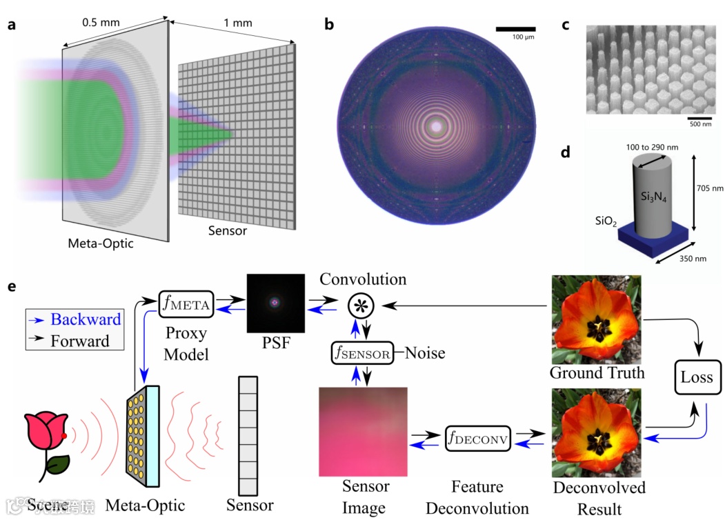 近几十年来,强度传感器的小型化使得今天的相机在许多应用领域中无处不在,包括医疗成像、商用智能手机、机器人和自动驾驶等。然而,更小一个数量级的成像仪可以在纳米机器人、体内成像、AR/VR和健康监测等领域实现许多新的应用。虽然亚微米像素的传感器确实存在,但由于传统光学的基本限制,进一步的小型化已被禁止。传统的成像系统是由一组层叠的折射元件组成的,用来校正像差,而这些笨重的透镜对相机占地面积有一个较低的限制。而进一步减少焦距又存在着较大阻碍,因为这会引起更大的色差。虽然超表面光学为这种超小成像仪提供了一条途径,但现有的方法所获得的图像质量远远低于笨重的折光替代方法,从根本上受限于大孔径和低f值的像差。