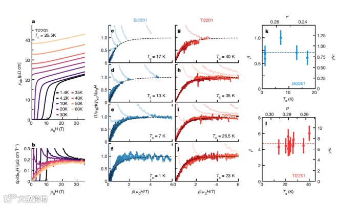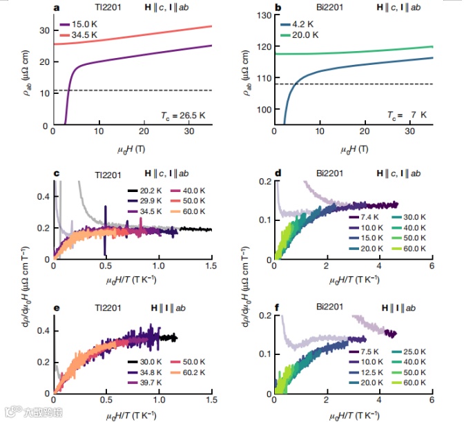1、本工作所有的Tl2201和Bi2201样品的衍生物dρab ( H,T )/dH在与H/T作图时都会崩塌到一条普适曲线上。此外,该导数的形式与纯正交MR的形式相同,表明pab ( H,T )中所有依赖于场和温度的项都可以用正交表达式很好地描述。