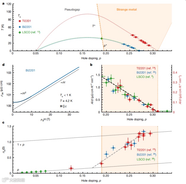 3、高场霍尔效应研究显示,在类似的掺杂范围内,霍尔数(25)从1 + p下降到p,同时观察到的超流密度随过度掺杂的下降,与超导电性微观理论(BCS)理论相悖。