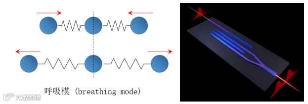 在中学物理课本关于三体耦合谐振子的实验中,有一种特殊的本征模式。在这种模式振动下,中间的谐振子保持静止,而两侧的振子则沿着相反方向做振动,体系呈现一张一弛的特性,因此这种谐振模式也被称为呼吸模(breathing mode),如图1(左)所示。这种特殊的呼吸模具有稳定的模式振动频率,此外,即便在外界扰动的情况下,其两侧振子之间所具有的反相的特性也可以严格地保持。实际上,这种“呼吸”现象是自然界多体相互作用系统中广泛存在的一种现象,如结构化学分子的振动、Paul阱中的离子、以及溶液中DNA的分子等等。