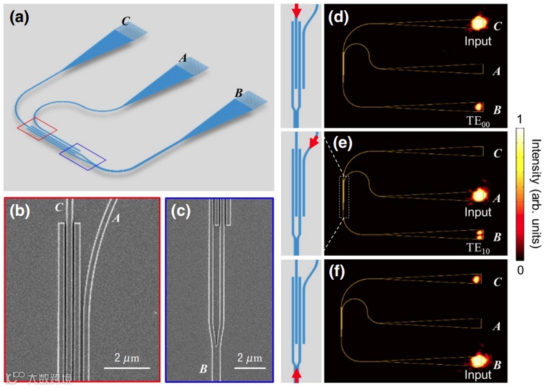 在实验中,研究人员利用硅波导来验证以上设想。他们首先设计了三端口系统来验证模式转化功能。如图3(a)所示。其中,从C端口输入的光(1550nm)无法激发呼吸模,只能从B端口以基模TE00输出(图3(d))。而如果从A端口输入,波导模式则可以高效地耦合到三波导系统并激发出其中的呼吸模式,信号最终从B端口以TE10模式输出。实验结果清晰的展示了在B端口输出的高阶模式(见图3(e)两瓣光斑)。有趣的是,如果从B端口反向输入,则只会从C端口输出,而A端口没有输出(图3(f)),这是模式对称性造成的。