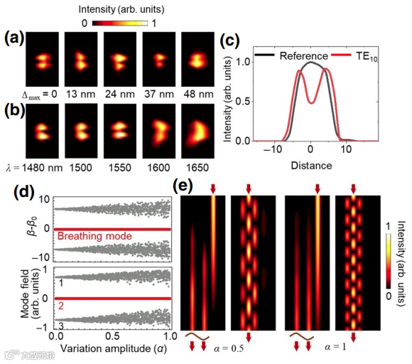 图 4:(a,b)结构与波长偏差下,模式转化的实验结果。(c)高阶模式输出光强与单根波导输出光强作对比。(d)呼吸模式在结构偏差下的表现出稳定性。(e)模式转化过程的稳定性。