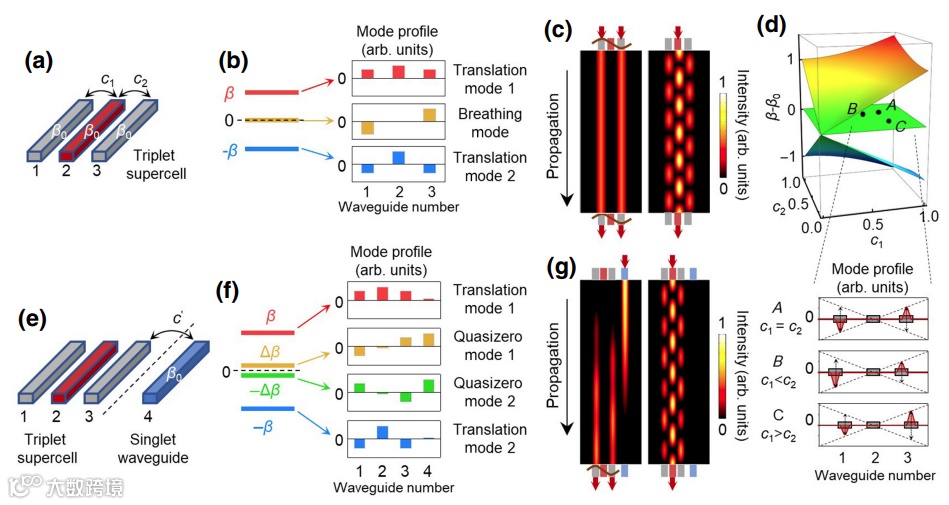 图2:(a) 三波导系统。(b) 本征模式及场分布。(c) 耦合模理论计算的光场演化。(d)耦合变化下的本征模式及场分布。(e)孤立波导与三波导系统的耦合。(f)本征模式及场分布。(g)光场演化。