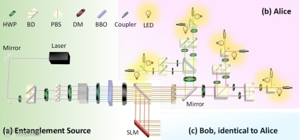 在本实验中,研究组首先利用多点泵浦的自发参量下转换过程制备出两光子多维(本实验中制备了2、4、8维)路径纠缠态,然后设计并实验实现了多维量子态的多出口测量装置,可分别对两个光子进行多达8输出的探测。为了研究环境噪声对高维量子通信的影响,研究组采用LED对单光子探测器照射的办法引入环境杂散光,通过调节LED的亮度即可方便的调节环境噪声的大小。研究组以基于纠缠的量子密钥分发为例进行了实验研究。研究结果表明:在噪声较小时,高维全空间编码能取得最佳的编码效率。具体而言,利用4维纠缠态和8维纠缠态,经过纠错和保密放大等后处理后,每对纠缠光子依然可以得到大于1比特的密钥,超越了两维比特系统所能达到的极限。而随着噪声增大,采用高维部分子空间编码的方式则更能对抗噪声的影响,实验结果显著优于两维比特系统,从而保证在高噪声环境中依然能实现高效的高维量子通信。