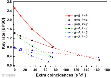 图2:实验结果图。横坐标为环境噪声的强度。纵坐标为每对光子能产生的密钥比特数。其中d为纠缠态的维度数,k为子空间的维度数。最下边的一条线对应两维比特系统。