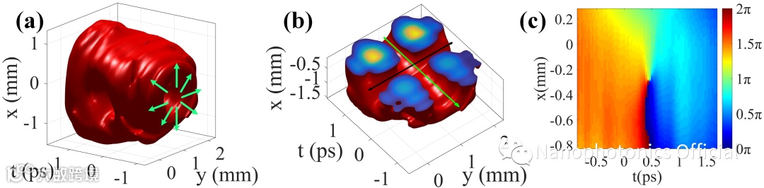 近日,上海理工大学詹其文教授团队在Nanophotonics发表最新文章,首次实验生成了带有横向轨道角动量的柱矢量偏振时空波包,展示了时空相位奇点可与空间偏振奇点共存。研究团队同时生成了径向偏振时空涡旋(如图1所示)和角向偏振时空涡旋,并通过斯托克斯参数测量和三维时空测量对所生成的时空波包的偏振和相位分布进行表征。实验结果充分表明在柱矢量时空涡旋中同时存在空间偏振奇点和横向时空奇点。