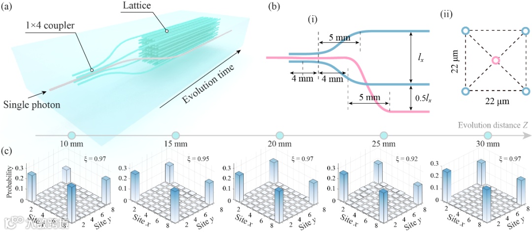 一分四耦合器和测得的角态光子分布概率。(a)光子晶格示意图。在晶格前设计了一个一分四耦合器。(b)一分四耦合器截面(i)和侧截面(ii)结构细节示意图。(c)用单光子叠加态激发晶格得到角态的实验结果。
