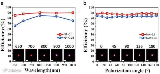 (a)实验记录了NA=0.24(点)和NA=0.1(方框)的TiO2超透镜聚焦效率随入射波长的变化。在这里,入射光是非偏振光。(b)在800nm处聚焦效率对偏振的依赖关系。(a)和(b)中的插图分别是NA=0.1的超透镜在不同波长和不同偏振下的焦点图像。