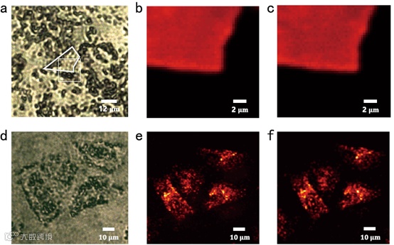 (a)在白光照明下,聚苯乙烯球覆盖微孔板上的纳米晶体(NCs)显微镜图像。示例用虚线标记。(b)NA=0.24的消色差超透镜记录的上转换荧光图像。(c)由N=0.26的商业消色差物镜记录的上转换荧光图像(MY10X-823,Mitutoyo)。(d)上转换NCsHeLa细胞的显微镜图像。E和f超透镜和商业物镜记录的上转换荧光图像。