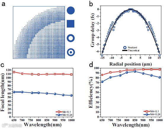 (a)设计的四分之一超透镜的布局。四个基本构建块(单元格)在插图中被放大。(b)宽带消色差所需的组延迟(实线)和TiO2纳米结构提供的值。(c)和(d)是数值计算的不同波长下NA=0.24(点)和NA=0.1(方格)的TiO2超透镜的焦距和效率。两种超透镜的直径分别为30和25μm。
