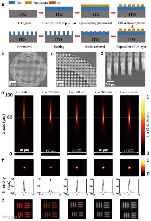 (a)制造过程示意图。采用高定向刻蚀工艺制备TiO2纳米结构。(b)和(c)是不同分辨率的消色差超透镜的上视SEM图像。可以清楚地识别出四种类型的纳米结构。(d)超透镜对应的倾斜扫描电镜图像。(e)和(f)为不同波长下x-z面和x-y面焦点的强度分布。下面的面板描绘了沿直径(实线)和拟合曲线(虚线)的强度分布。(g)由消色差超透镜记录的1951年美国空军分辨率目标6号元素第7组图像。